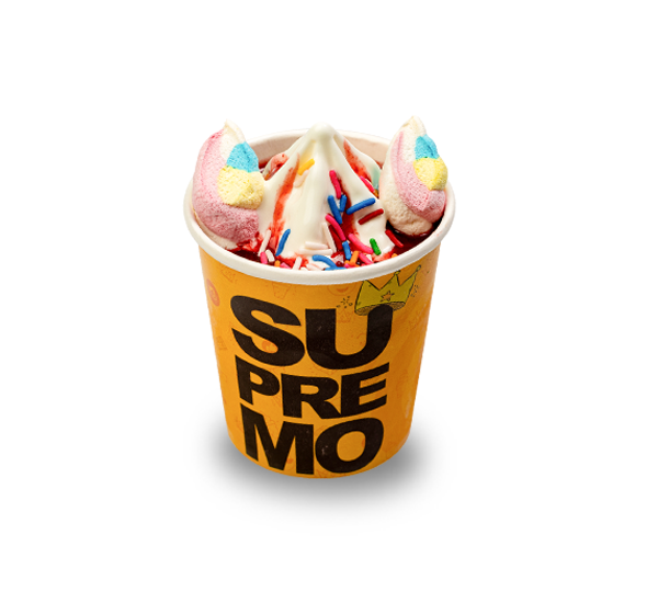 delicioso sorvete de baunilha acompanhado de marshmellow granulado colorido e polpa de morango