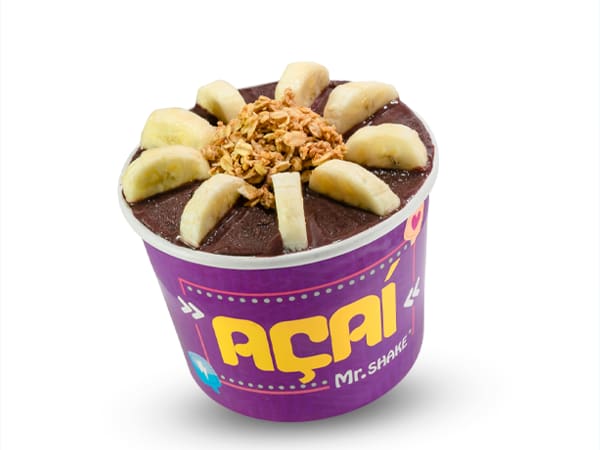 Creme de açaí com 4 adicionais em camadas. Faça sua combinação com banana, leite Ninho, leite condensado e granola.
